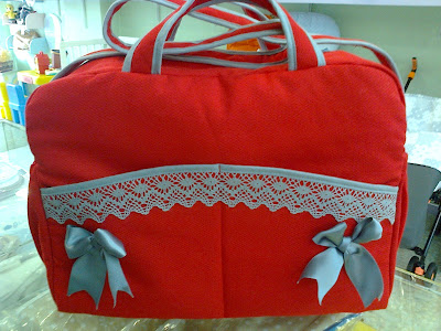 Saco de silla realizado en piqué pach work gris combinado con piqué rojo . Bolso de silla plastificado con precioso bordado . El acabado del saco es perfecto .